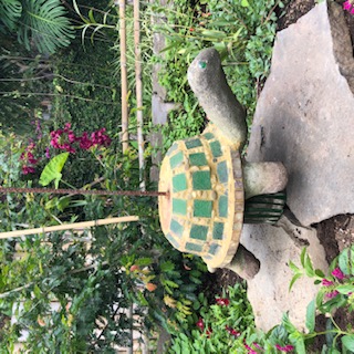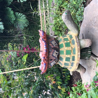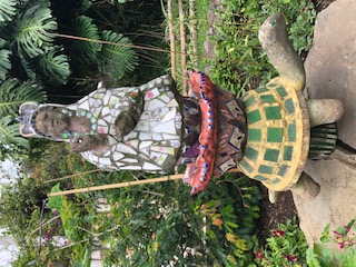 I've had the opportunity to create a number of fun mosaic art works for her over the years. One of those commissions, a mosaic sculpture of Kwan Yin, the buddhist goddess of compassion. Kwan Yin has been presiding over Hummingbird Heaven for many years, under the shade of a beautiful mimosa tree. Over time, she had lost a few of her mosaic details, so a renovation was in order.